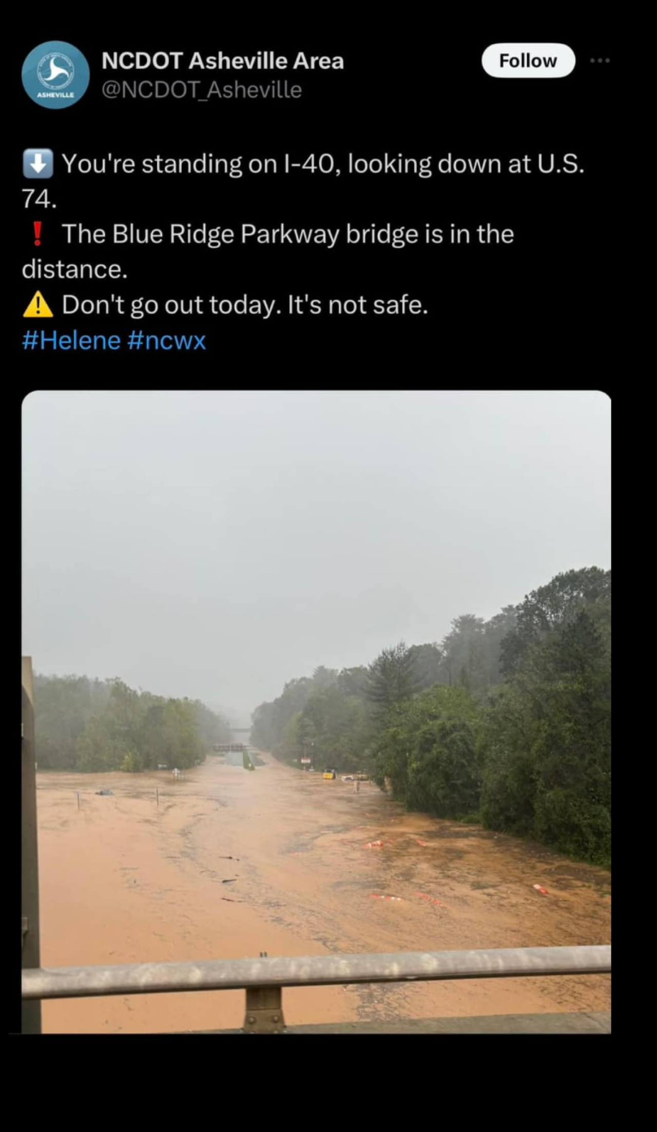 “I-40 and I-26 are impassable in multiple locations. All roads in Western North Carolina should be considered closed. Motorists should not travel in this area, should not attempt to drive through standing water, and must respect barricades and road closure signs.”
