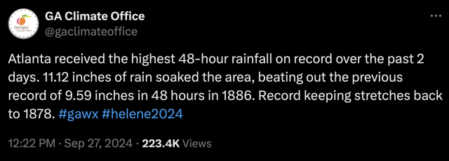 - Chattahoochee Riverkeeper posted this on Facebook out of Georgia: “Parts of the Chattahoochee River Basin experienced major flooding as Hurricane Helene moved across the southeast today. The Chattahoochee River near CRK’s metro Atlanta office has risen by at least 25 feet since Tuesday. The storm has passed, but floodwaters continue rising in some areas. We hope everyone is staying safe and our hearts go out to all who have been impacted by the storm.”