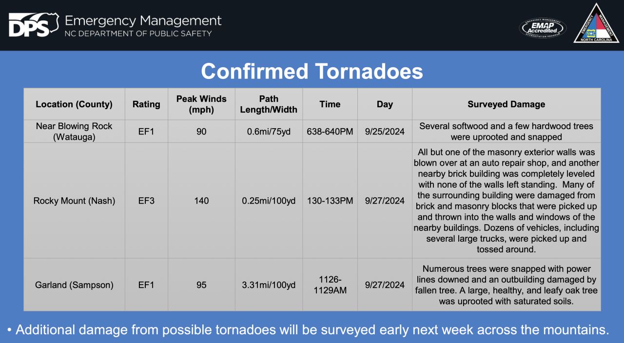 Three tornadoes were confirmed in North Carolina.