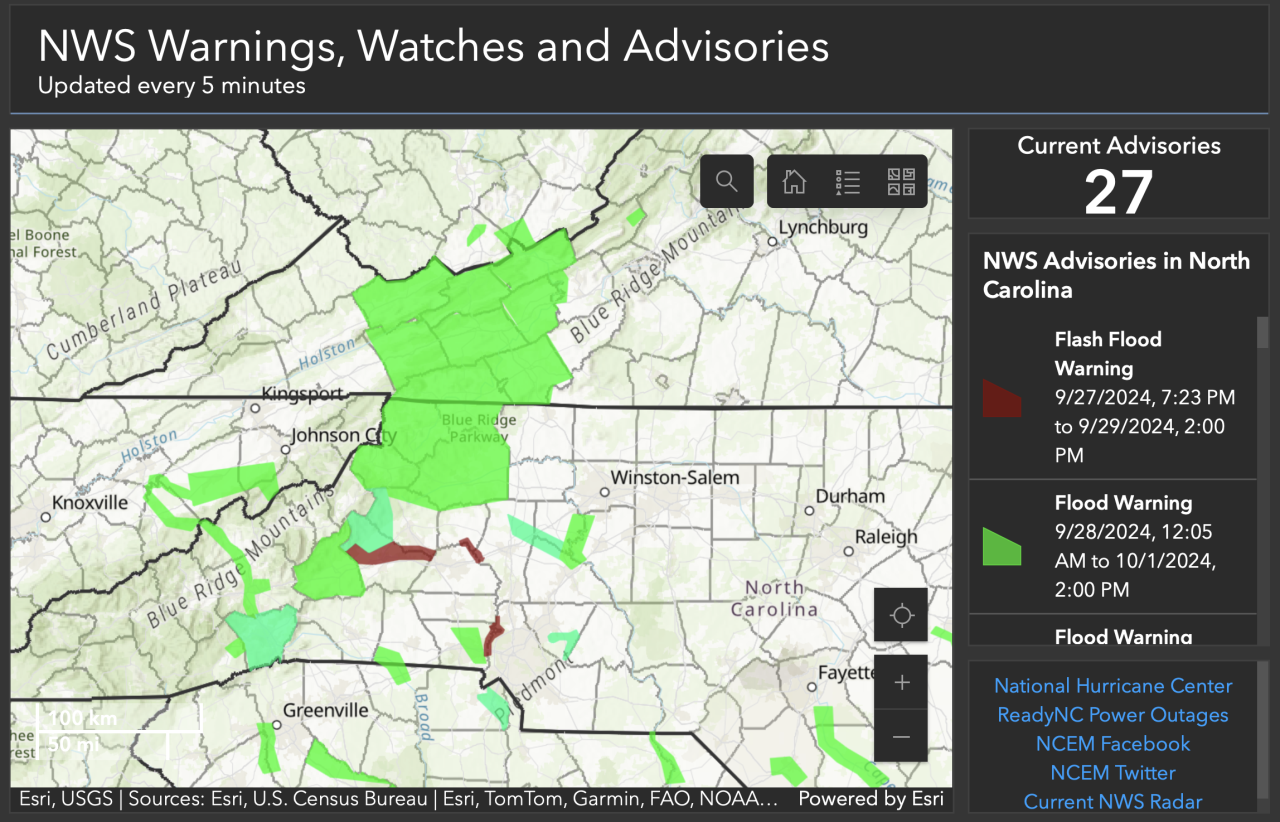 - The National Weather Service has declared a flash flood emergency for Haywood County in Western North Carolina. The warning extends through 10:15 a.m. Up to 20 inches of total rain are possible with the remnants of Helene and preceding rain events. The Weather Channel reports multiple water rescues are under way. Flash flood warnings are also in place in Graham and Swain counties.
