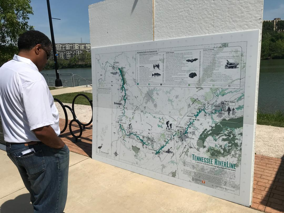 A man looks at a map of the Tennessee RiverLine during the paddling trail’s kickoff in May 2021 at Suttree Landing in downtown Knoxville. Thomas Fraser/Hellbender Press