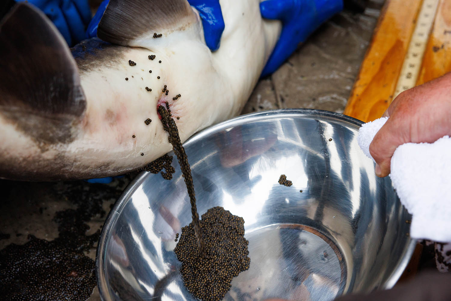 Biologists with the Sturgeon Working Group collect eggs from a female lake sturgeon earlier this spring in Shawano, Wisconsin. The eggs are transported and then hatched to restore juvenile lake sturgeon to their original range, including the Cumberland and Tennessee rivers in Tennessee.  Doug Strickland/Tennessee Aquarium